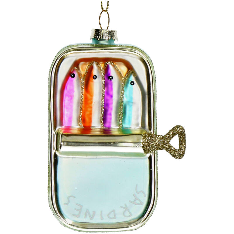 Kuglen er udformet som en klassisk dåse sardiner, komplet med små detaljer, der får den til at ligne en rigtig konservesdåse.