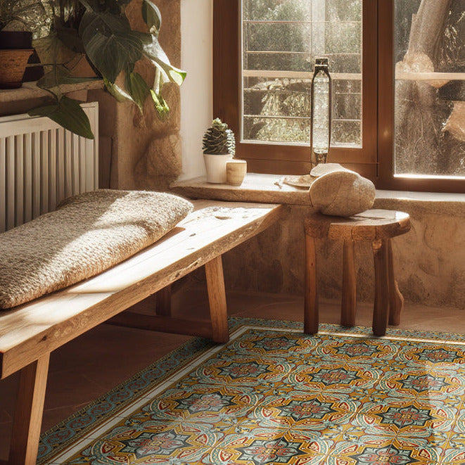 Fantastik vinyl måtte til gulvet - der holdes solidt på plads af sin egen vægt.