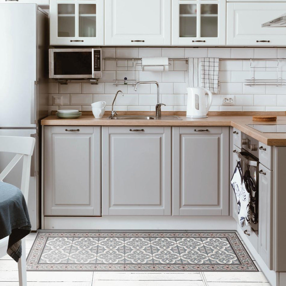 Fantastik vinyl måtte til gulvet - der holdes solidt på plads af sin egen vægt.