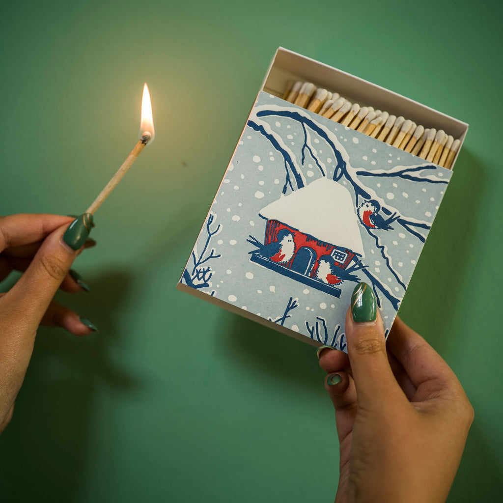 Tændstikkerne kommer i en super fin æske med et smukt motiv. Æskerne er trykt på en bogtrykmaskine, som man brugte i gamle dage til at lave bog forsider.