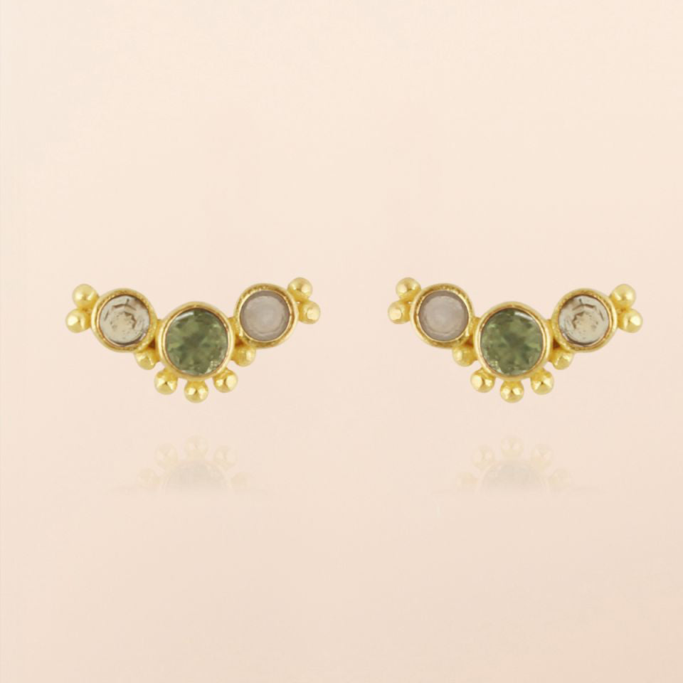 Ørering med 2,5 mm rund peridot, 2 mm rund ferskenmånesten og citrin med prikker.