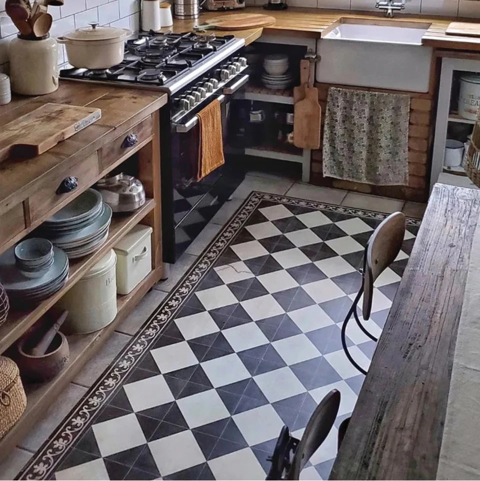 Fantastik vinyl måtte til gulvet - der holdes solidt på plads af sin egen vægt.