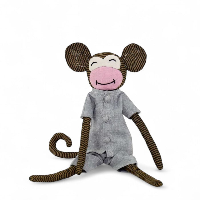 Finurlige lille Molly - en abe i blødt, håndvævet bomuld, fyldt med Kapok, som er et økologisk bæredygtigt og allergivenligt fyldmateriale.